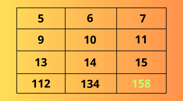 Dit is de oplossing van de puzzel: het ontbrekende getal is 158. De uitleg is als volgt: de interactie tussen de getallen betreft de kolommen en verloopt van onder naar boven. Vanaf de eerste hebben we 5, 9, 13 en 112. De uit te voeren bewerking is: 13 x 9 - 5. Het resultaat is dus 112. Hetzelfde geldt voor de tweede kolom: 12 x 10 6 = 134.