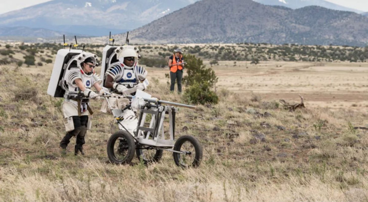 We bevinden ons in Arizona, in de Verenigde Staten, en meer precies in het vulkanische veld San Francisco, dat bestaat uit meer dan 500 vulkanische kloven. Dit is een ideale omgeving, onder de omstandigheden die hier op aarde beschikbaar zijn, om de apparatuur te testen waarmee het mogelijk zal zijn om met de Artemis III-missie naar de maan te gaan. Nadat ze speciale ruimtepakken hadden aangetrokken, simuleerden de astronauten enkele maanwandelingen, om op alle eventualiteiten voorbereid te zijn.