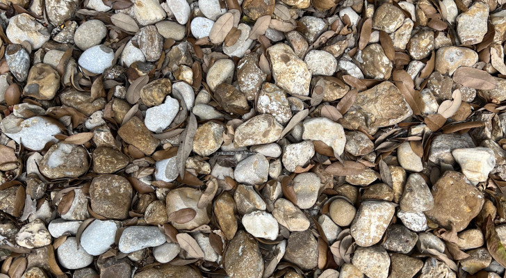 Is het jou gelukt om de ring te zien op dit stukje strand bedekt met kiezels, schelpen en gebladerte?